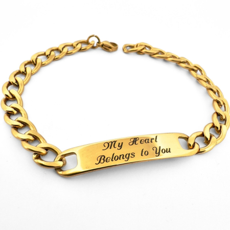 Brățară personalizată din oțel inoxidabil auriu, cu plăcuță gravabilă și lanț. Gravură laser vizibilă, ideală pentru un cadou cu semnificație.