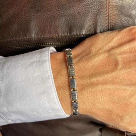 Brățara este realizată din oțel inoxidabil placat auriu, cu un finisaj lucios ce atrage privirile. Este disponibilă în două dimensiuni – potrivită pentru orice tip de încheietură.