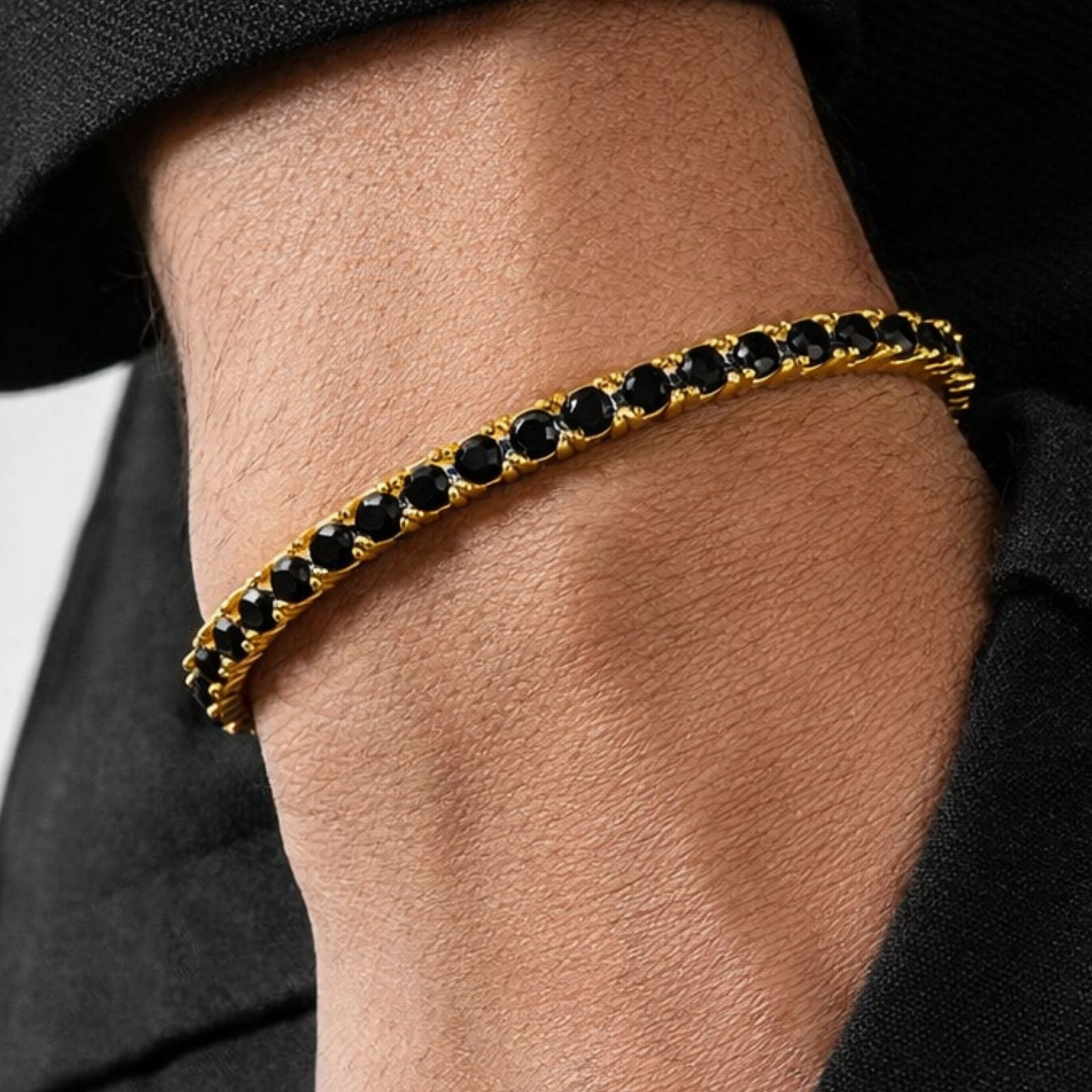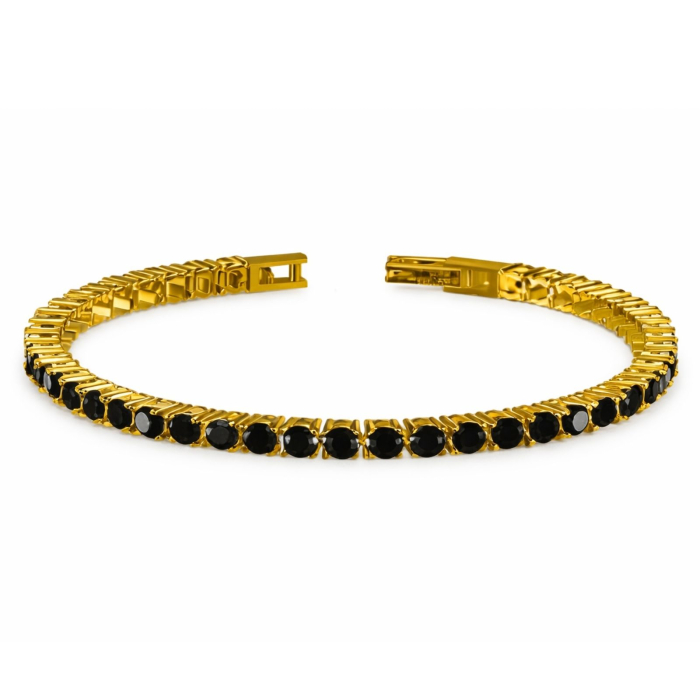 O brățară tennis placată cu aur 18K și decorată cu cristale de zirconiu negru de 3 mm, creată pentru cei care apreciază eleganța discretă și stilul atemporal.