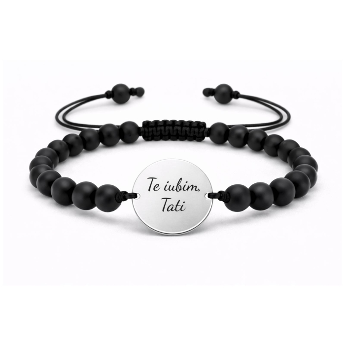 Brățară bărbătească cu biluțe de onix și bănuț din Argint 925, personalizabil prin gravură. Un accesoriu rafinat ce aduce eleganță și personalitate fiecărei ținute.