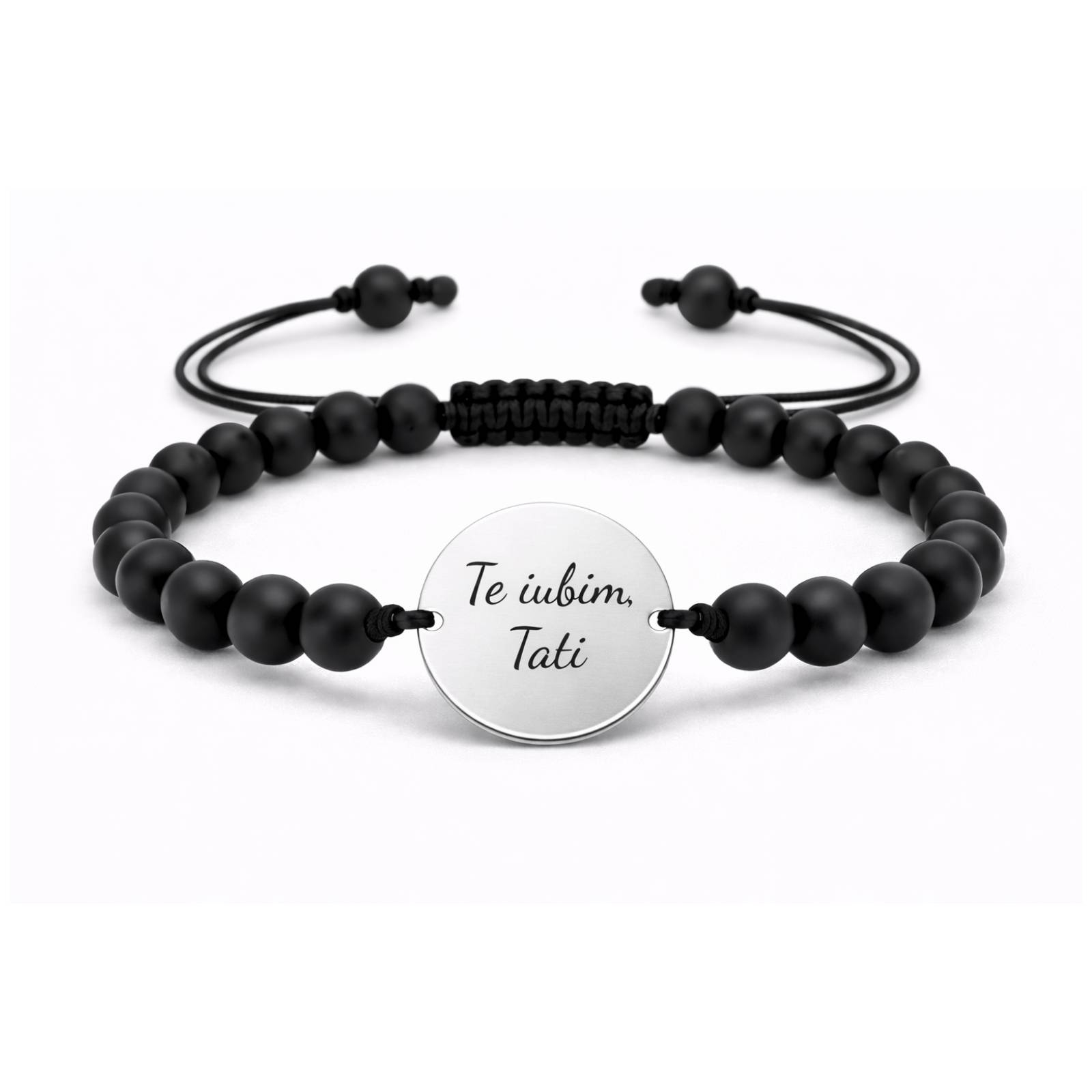 Evidențiază-ți stilul sofisticat cu această brățară bărbătească unică, ce combină eleganța argintului 925 cu forța și misterul biluțelor de onix de 6 mm. Realizată manual, această bijuterie iese în evidență nu doar prin designul său remarcabil, ci și prin detaliile sale distincte: un șnur împletit ajustabil, conceput să se potrivească perfect oricărei încheieturi, și un bănuț din argint fin, gata să fie personalizat cu gravura ta preferată.