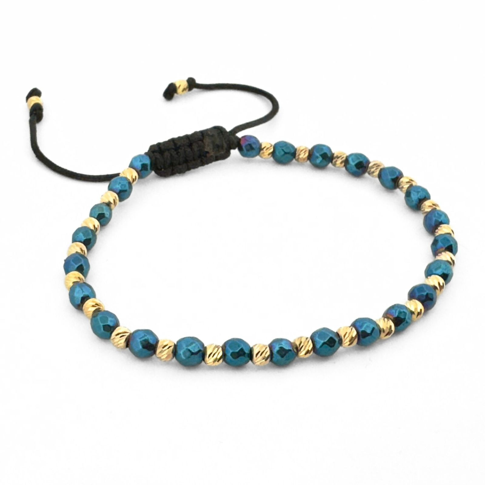 Brățara este realizată manual din argint 925 placat cu aur 24K și pietre semiprețioase Hematit albastru fațetat, montate pe un șnur reglabil rezistent.