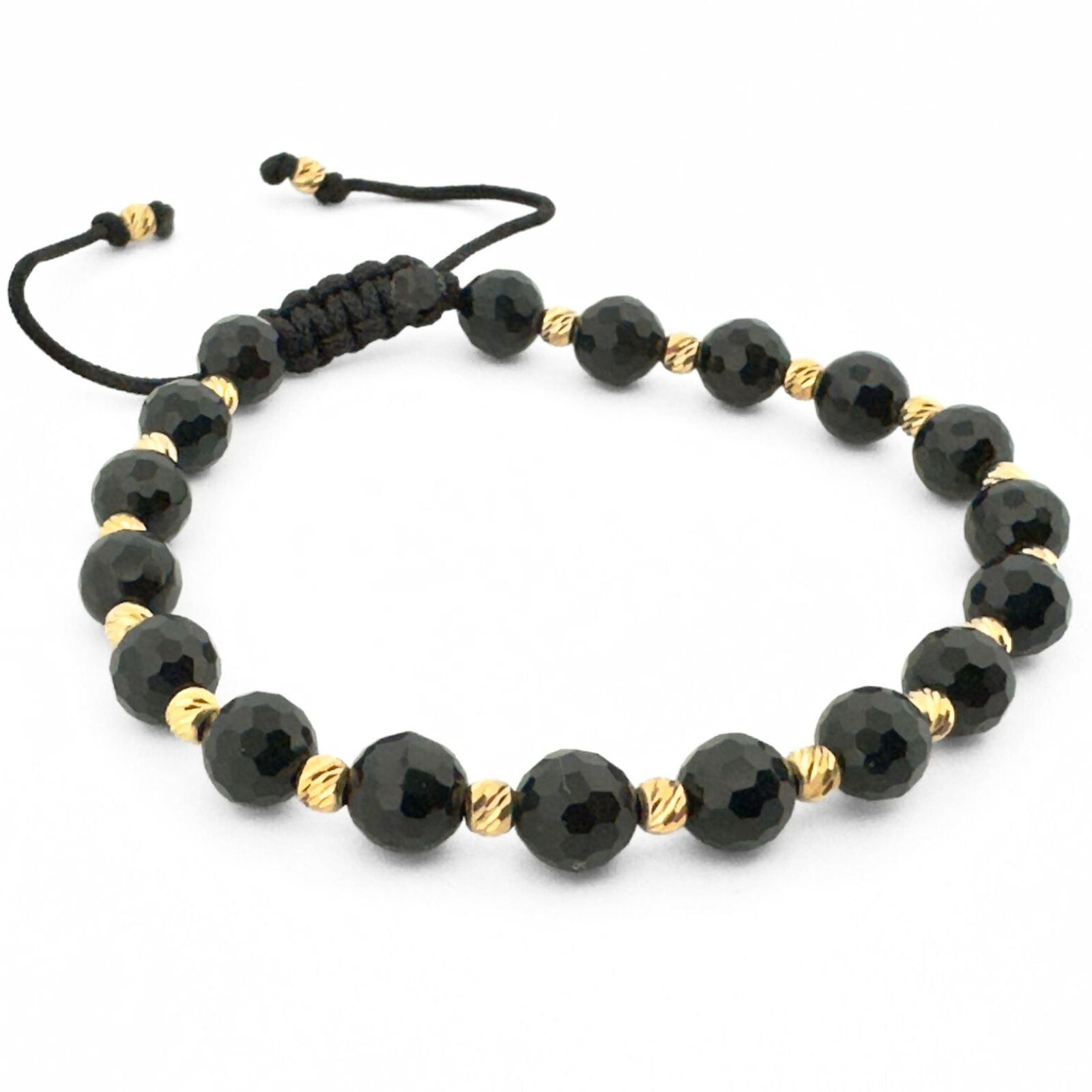 Fiecare brățară este creată manual cu grijă și precizie. Biluțele din argint placate cu aur 24K de 3 mm se combină perfect cu pietrele Onix negru fațetat de 6 mm, oferind un efect vizual sofisticat, în care lumina se reflectă subtil în fațetele pietrelor.
