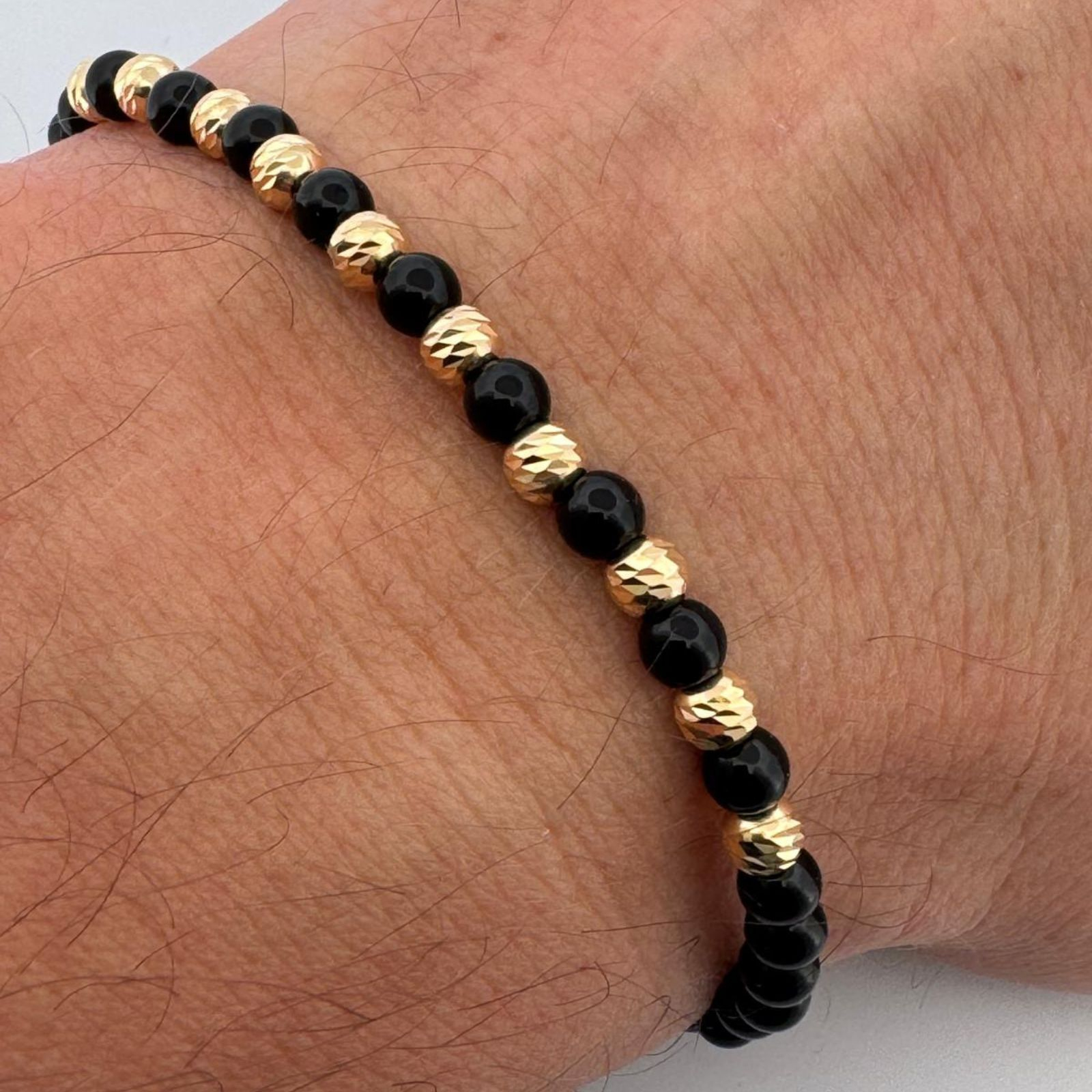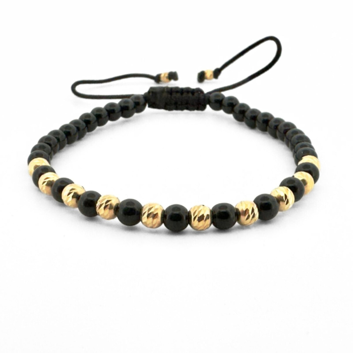 Brățara este realizată manual folosind pietre naturale de onix negru lucios de 4 mm, completate de 10 bile din argint 925 placate cu aur 18K de 4 mm, care creează un contrast rafinat între negrul intens al pietrei și strălucirea aurului.