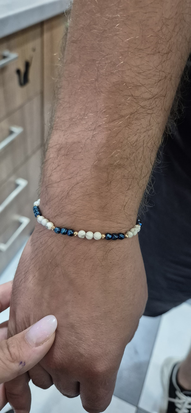 Estetică deosebită și Funcționalitate: Brățara combină albul calmant al howlitului cu albastrul intens și strălucitor al hematitului, creând o bijuterie plină de farmec și contrast. Bilele de aur de 14K adaugă un accent de lux, transformând brățara într-un accesoriu ce poate fi purtat la orice tip de ținută. Fie că alegi să o porți la o întâlnire elegantă sau într-o zi obișnuită, această brățară îți va sublinia stilul și personalitatea într-un mod subtil și sofisticat.