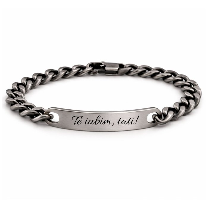 Brățara pentru bărbați este realizată din oțel inoxidabil cu finisaj mat/oxidat, de culoare argintie, cu un lanț tip cuban (cuban link), cunoscut pentru aspectul său masiv și structurat. Este prevăzută cu o plăcuță gravabilă perfect integrată în design.