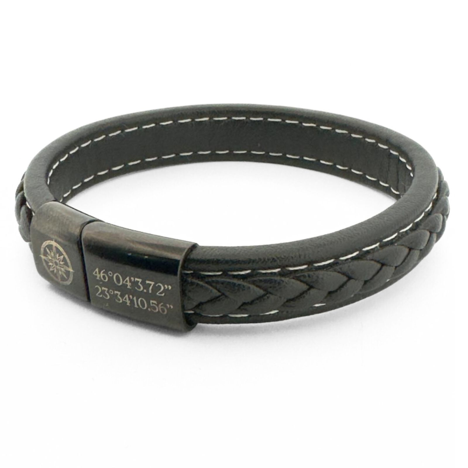 Brățară bărbătească din piele naturală neagră împletită, cu închidere magnetică din inox și gravură text personalizată. Cadou unic pentru el.