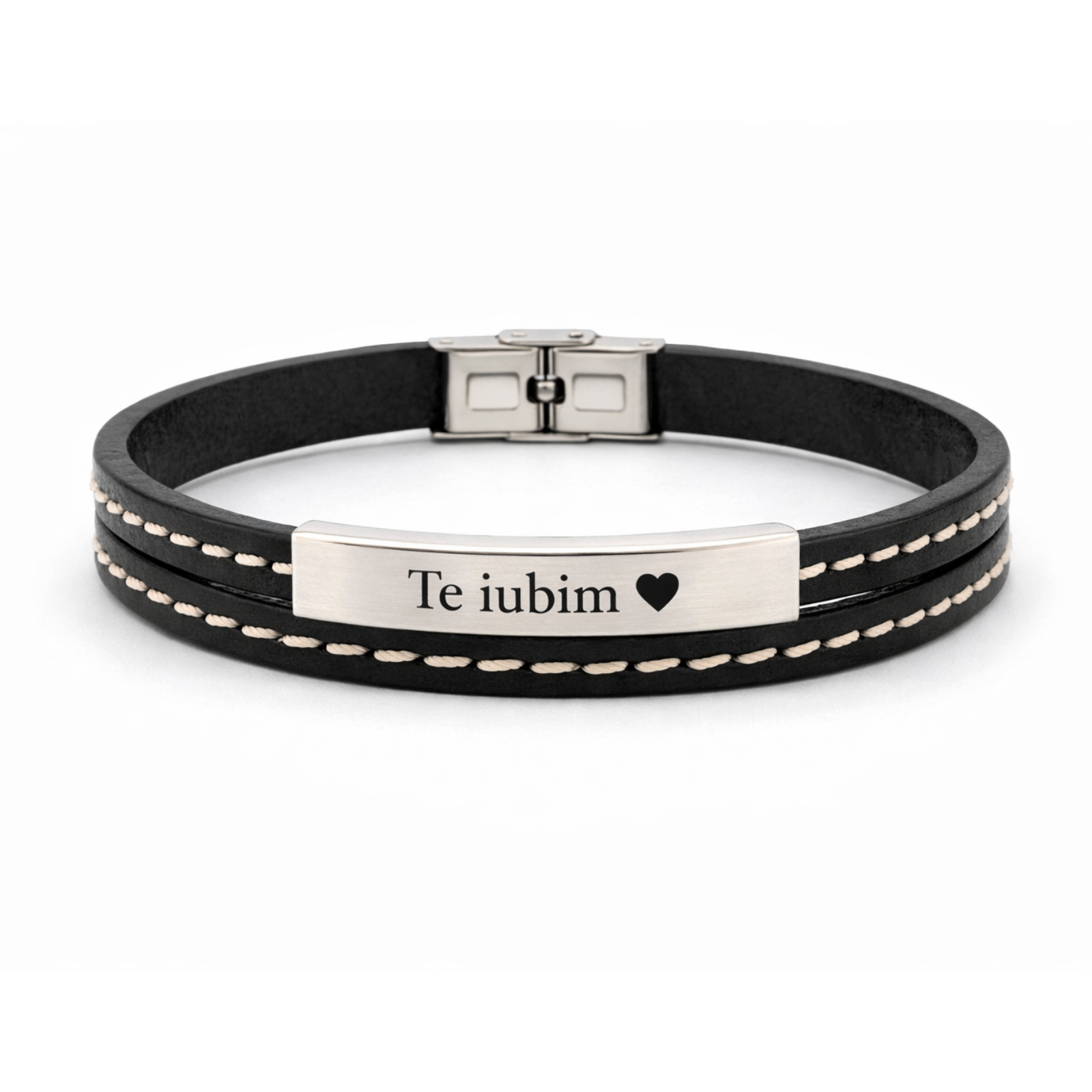 O brățară discretă, dar plină de sens. Realizată manual din piele naturală neagră cu cusături contrastante și plăcuță din inox, această brățară devine un accesoriu personal atunci când adaugi un mesaj care contează cu adevărat.
