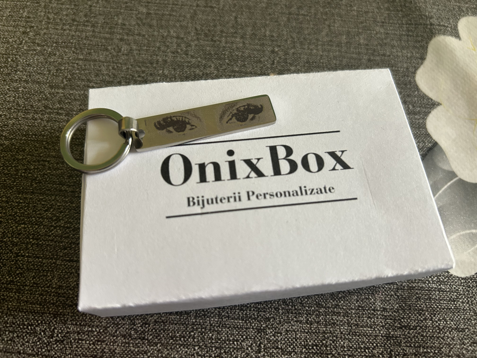 Breloc personalizat cu poză și text gravat laser, din oțel inoxidabil. Ideal pentru gravura ochilor unei persoane dragi și a unui mesaj simbolic. Garanție pe viață.
