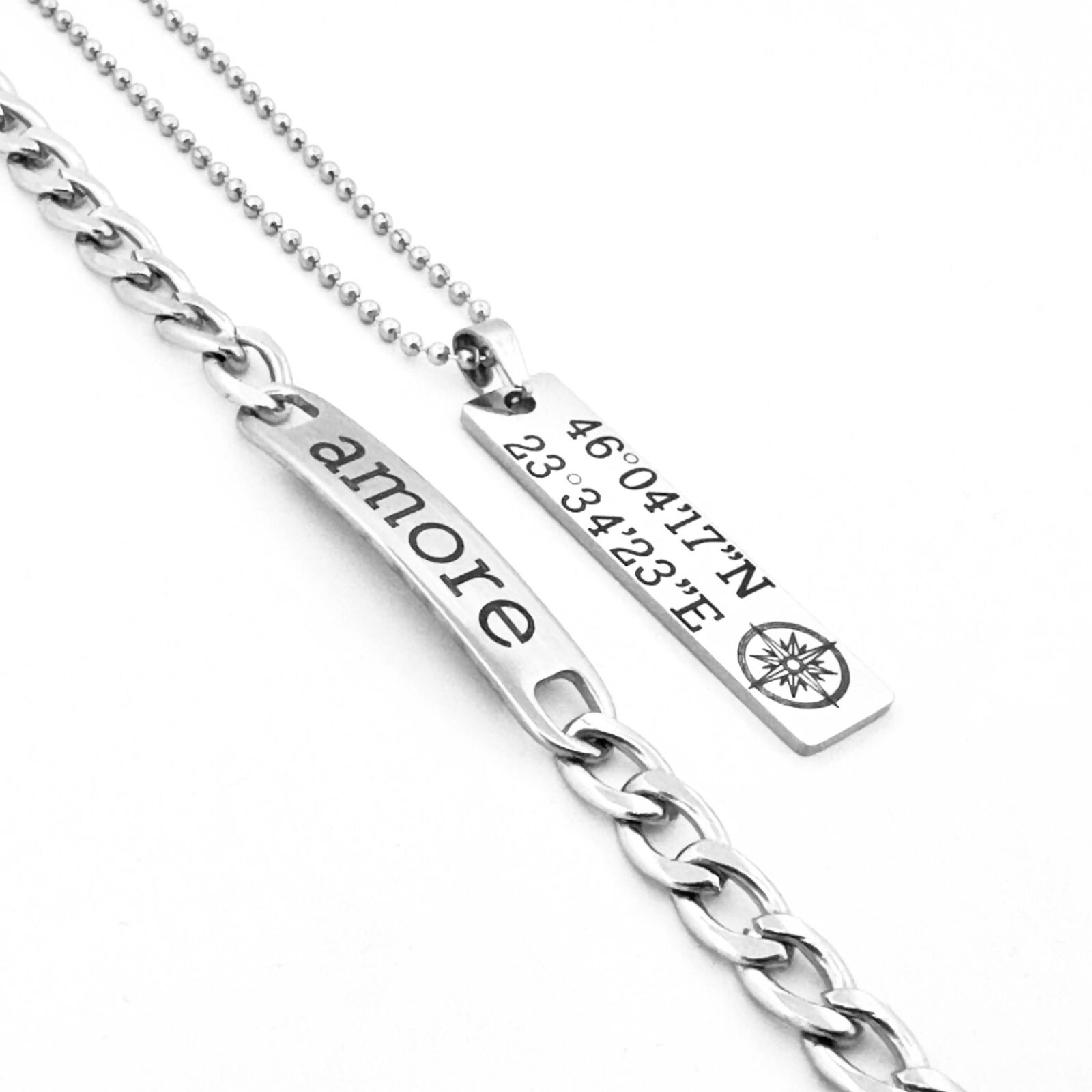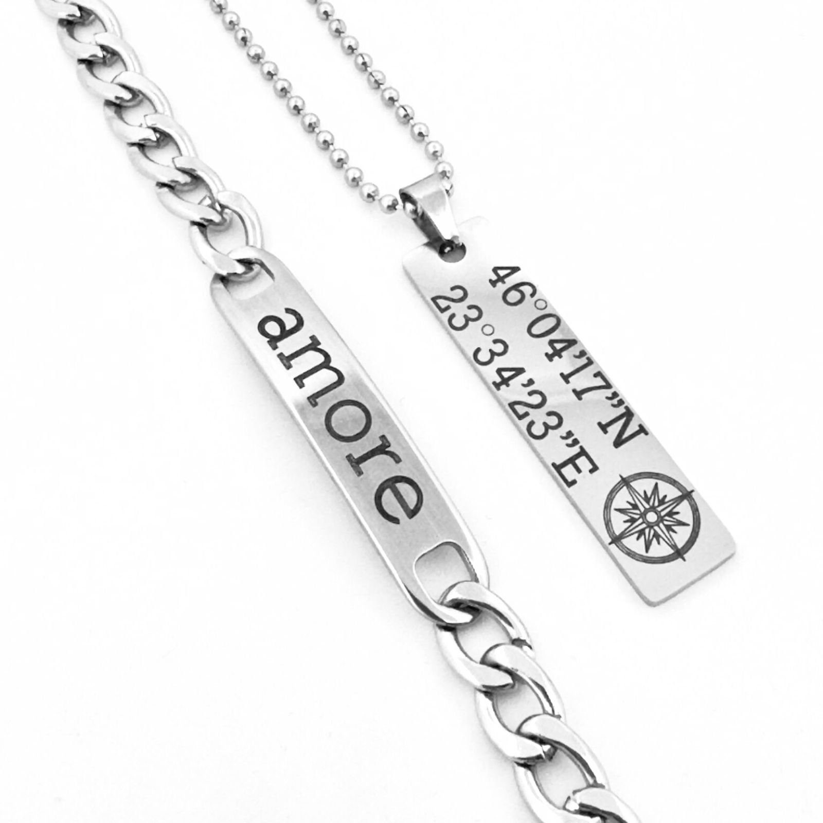 Comandă acum setul de bijuterii personalizate și oferă un cadou masculin, elegant și durabil — două bijuterii din oțel, gravate cu mesajul tău unic.