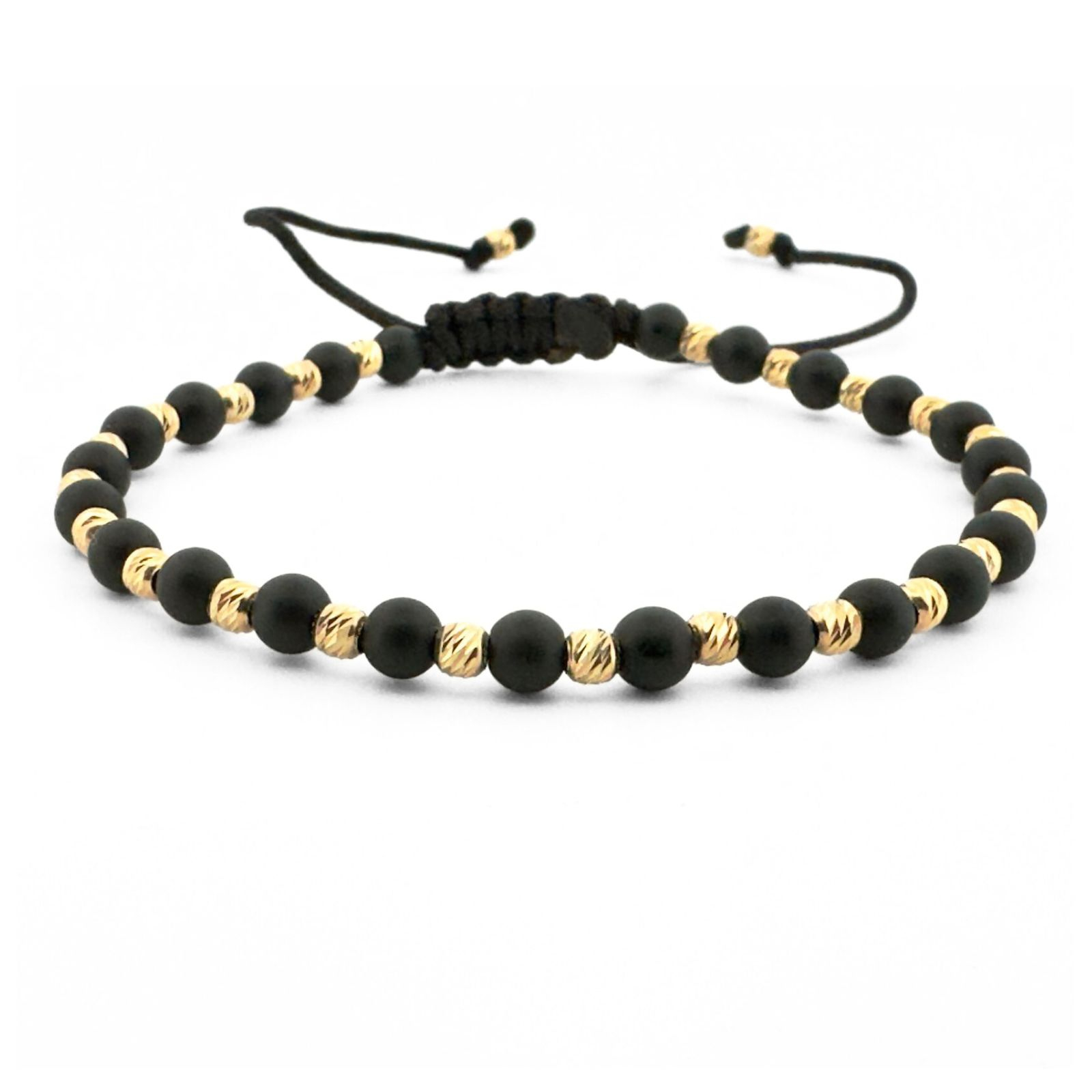 Brățara este realizată din pietre naturale onix negru mat de 4 mm și biluțe din argint 925 placate cu aur 14K, montate pe șnur reglabil rezistent.