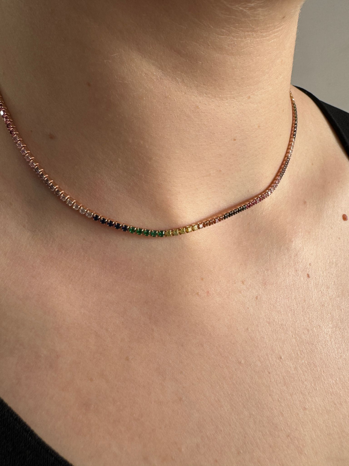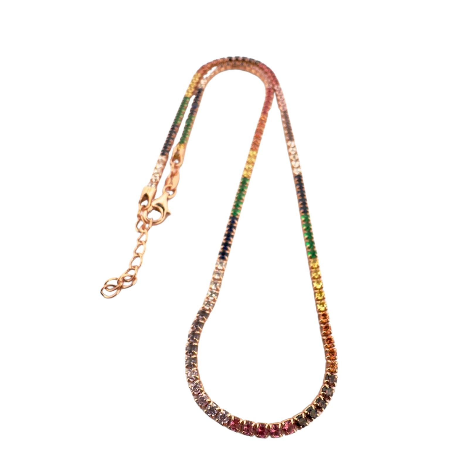 Comandă acum acest colier tennis din argint placat cu aur roz și cristale multicolore – o bijuterie plină de viață, stil și feminitate. Completează-l cu brățara asortată pentru un set cu adevărat special.