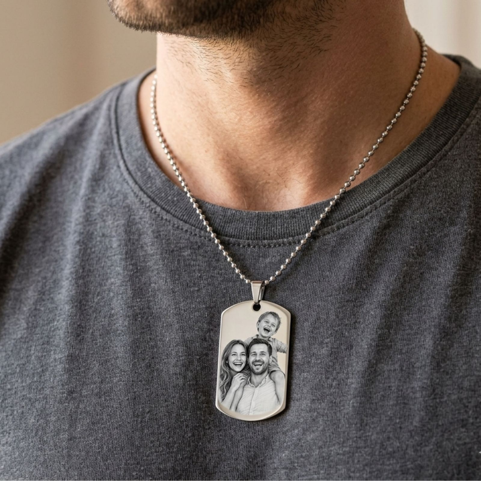 Există momente și oameni pe care nu vrei să îi uiți niciodată. Cu acest lanț Army personalizat cu poză și text, poți transforma o fotografie specială într-o amintire pe care o porți zilnic. Fie că este vorba despre familie, parteneră sau un moment important din viața ta, acest colier devine mai mult decât un accesoriu – devine o poveste personală.