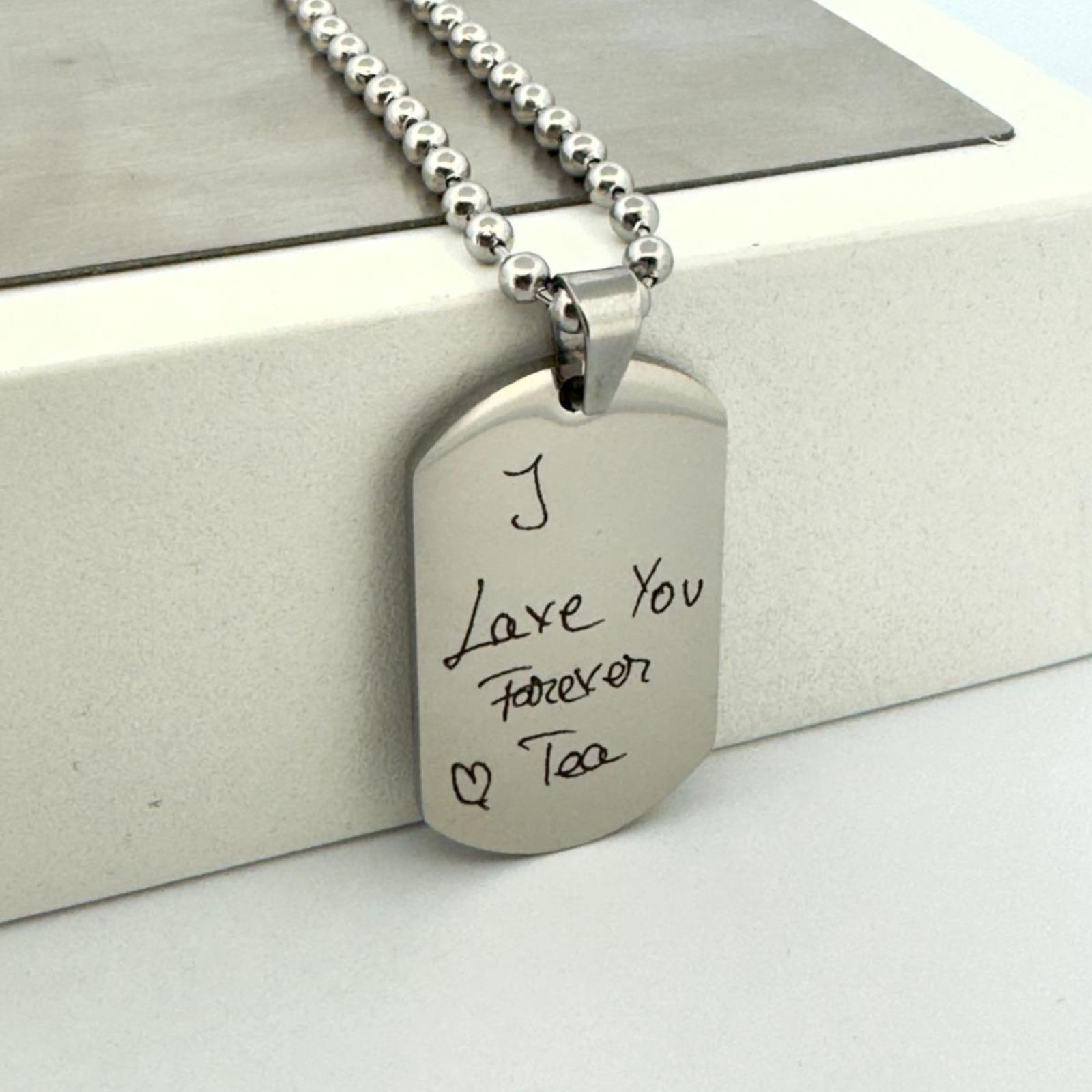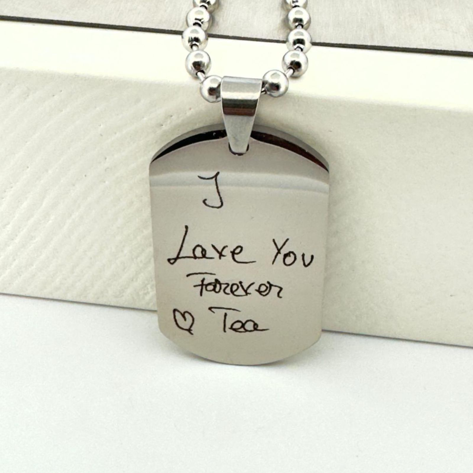 Lănțișorul gravat cu scris de mână este una dintre cele mai emoționante forme de personalizare. Poate fi scrisul copilului către tată, o dedicație pentru iubit, un mesaj de la soție sau chiar semnătura unei persoane dragi.