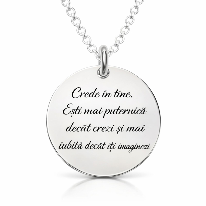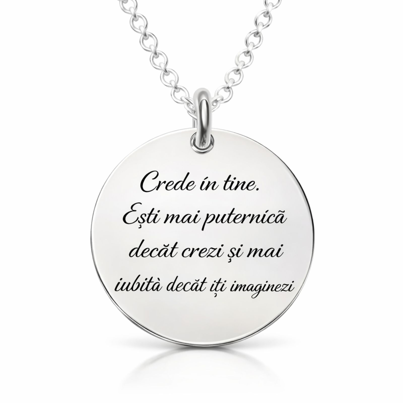 Uneori, câteva cuvinte sunt suficiente pentru a spune tot. Cu acest lănțișor cu bănuț personalizat cu text, poți transforma un mesaj important într-o bijuterie pe care o porți zilnic.