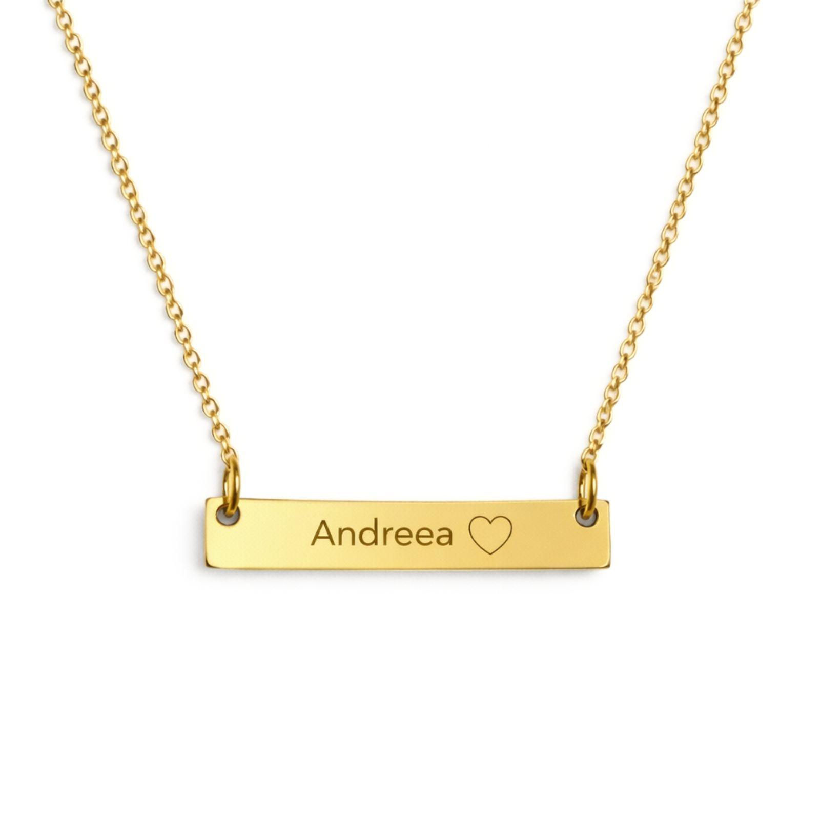 Acest colier minimalist este perfect pentru a grava un nume drag, o dată cu semnificație specială sau un mesaj scurt. Poți adăuga un text diferit pe fiecare parte a plăcuței — de exemplu: