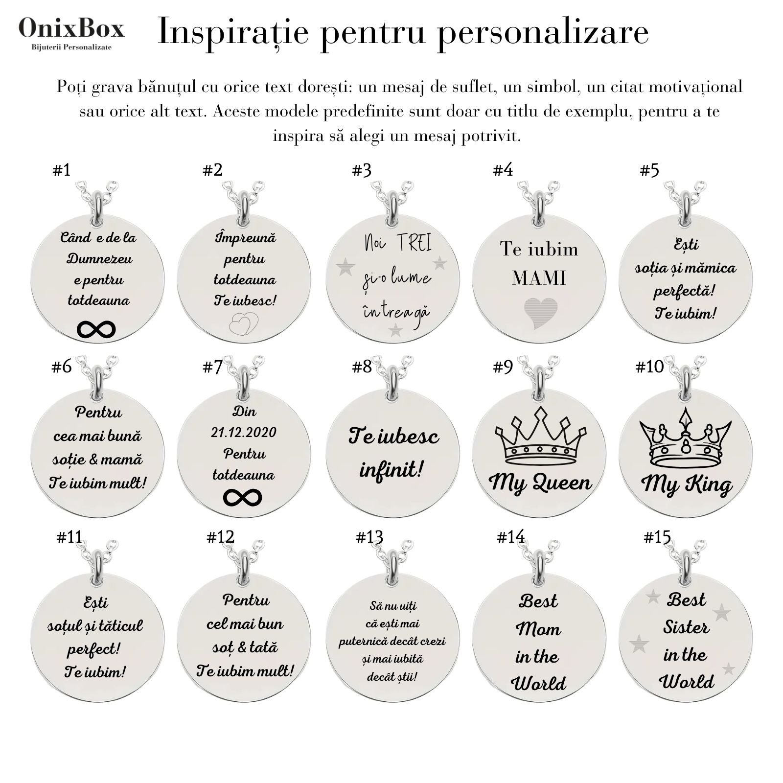 Un lănțișor personalizat cu nume este mai mult decât un simplu accesoriu – este un simbol purtat aproape de inimă. Gravează pe bănuț numele persoanei iubite, al copilului, al surorii sau chiar al tău. Poți adăuga și un simbol reprezentativ – inimă ❤, infinit ∞, floare ✿, cruce ✝ sau orice simbol care are semnificație pentru tine.