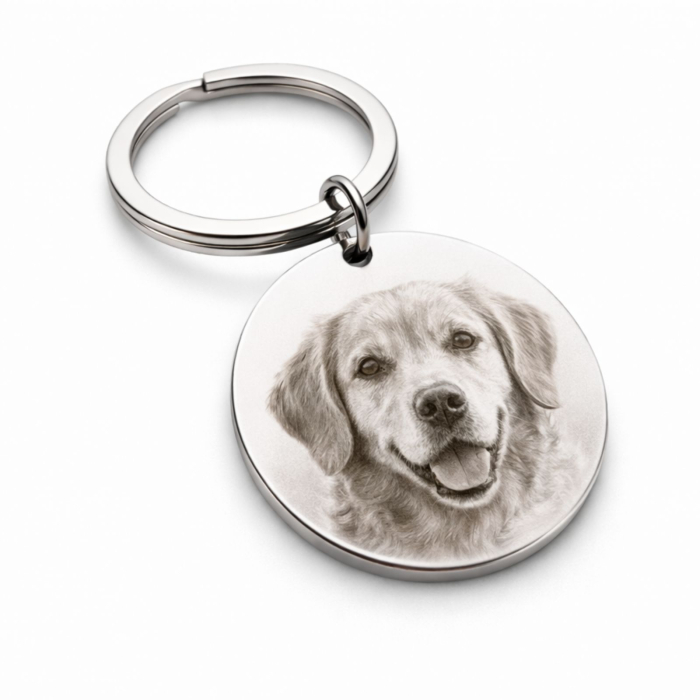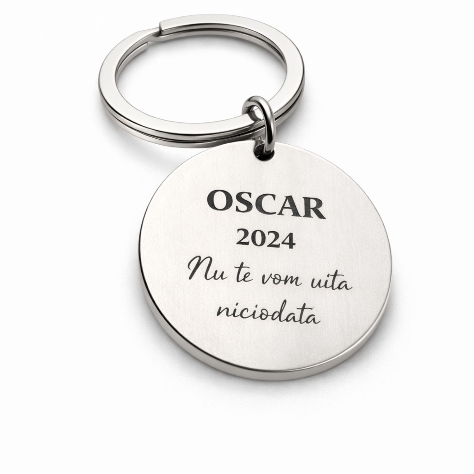 Creează un obiect cu adevărat personal: acest breloc gravat cu poză și text, sub forma unui medalion rotund din inox, îmbină estetica elegantă cu puterea emoțională a unei amintiri gravate.